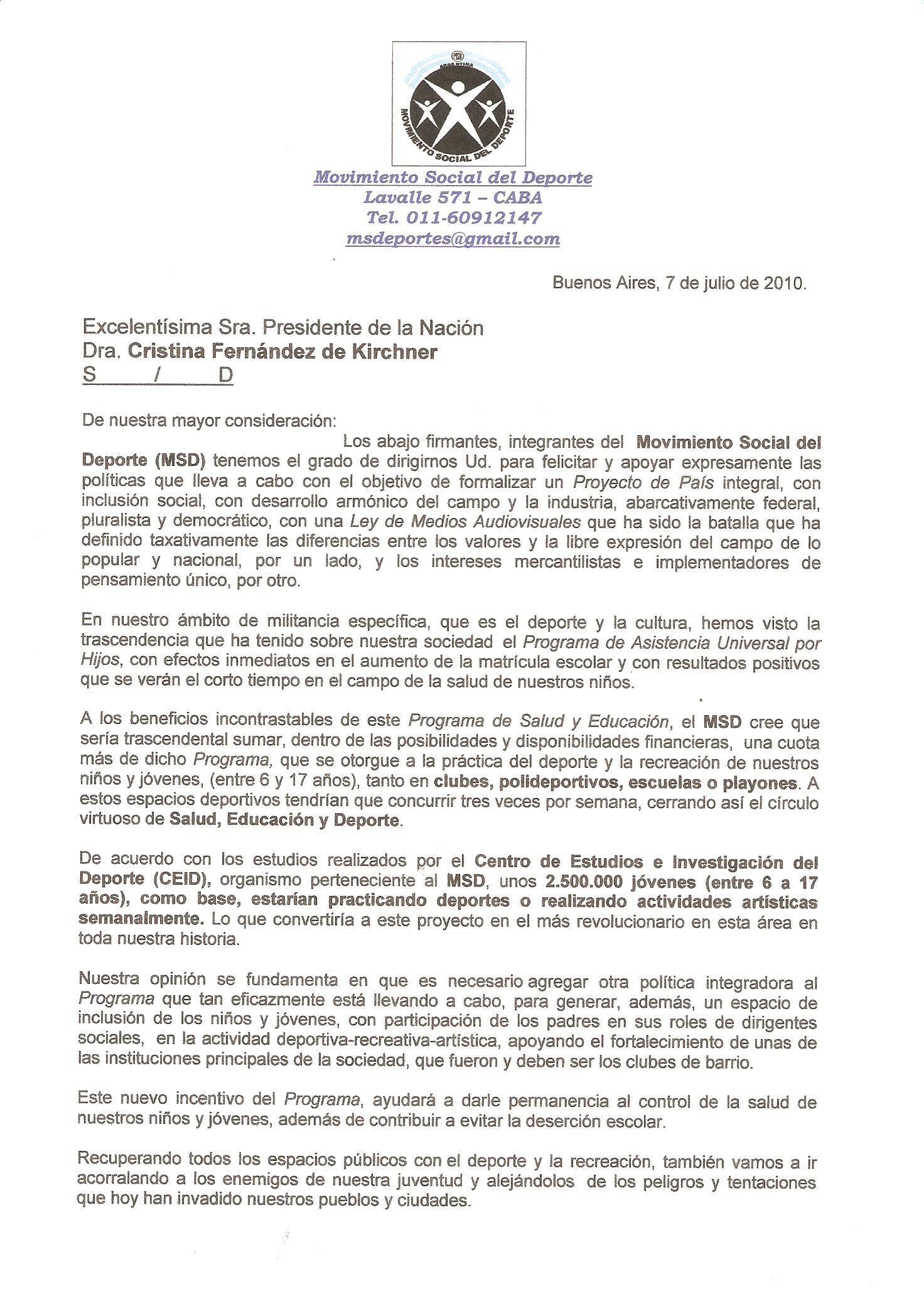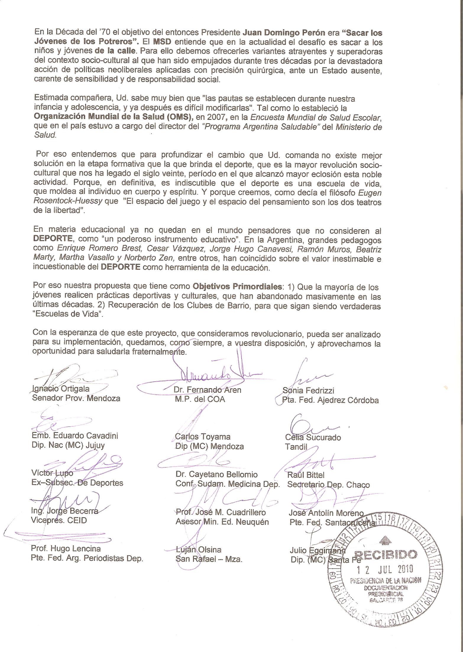 *Esta es una propuesta, muy parecida, a la del Movimiento Social del Deporte (MSD) que se presentó a la Presidenta de la Nación el 7 julio del año 2010. También es un proyecto del Ley presentado en el Senado de la provincia de Mendoza (2010) y en el Senado de la provincia de Buenos Aires (2011) y al Consejo Nacional del Deporte (CO.NA.DE.) por el subsecretario de Deporte de Chaco, Raúl Bittel (2010).
