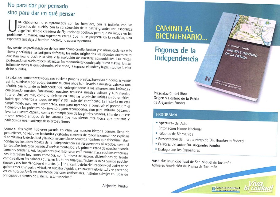 El próximo viernes 30 de Agosto en la Sede de Prensa de la provincia, ubicado en calle Junín 775 a horas 19, presenta su libro (ORIGEN Y DESTINO DE LA PATRIA) un luchador de la Cultura Nacional, Alejandro Pandra.